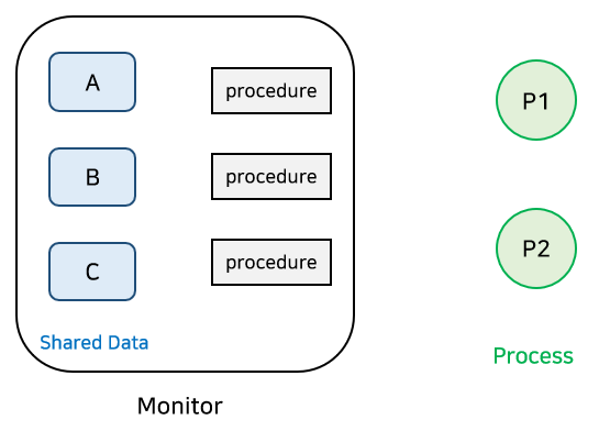 프로세스가 공유 데이터를 사용하기 위해서는 반드시 모니터 내의 Procedure를 통해야 한다. 그리고 동일한 시간엔 오직 한 프로세스나 스레드만 모니터에 들어갈 수 있다.