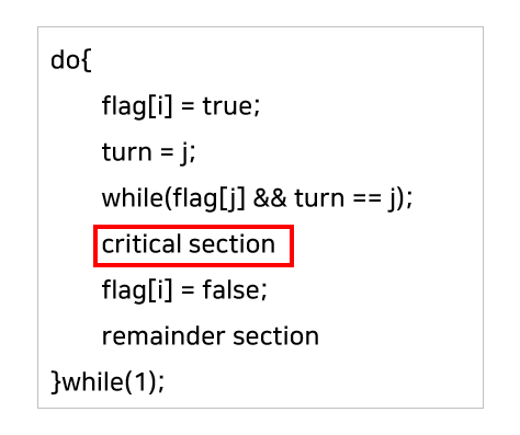 Peterson's Algorithm은 이전의 알고리즘 1과 2를 합쳐놓은 개념이다. turn 변수와 flag 변수를 동시에 사용한다.