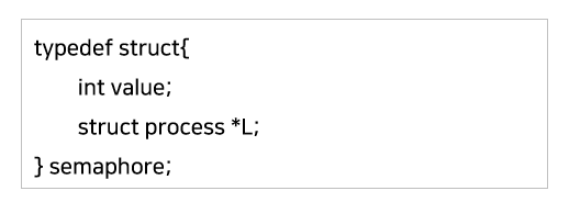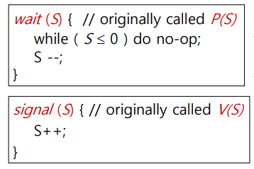또 세마포어 변수는 오직 두 개의 atomic 한 연산을 통해서 접근할 수 있다. 한 프로세스가 세마포어 변수를 수정할 때 다른 프로세스가 동시에 같은 세마포어 변수를 수정할 수 없다.