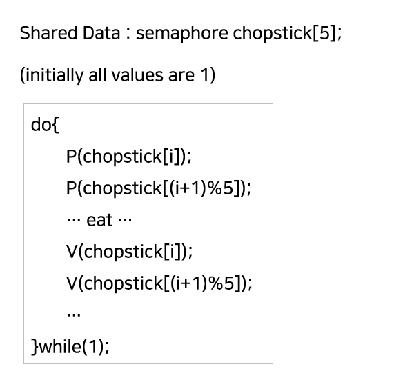 하지만 이 방식은 만약 모든 철학자가 식사를 하기를 원해서 각자 왼쪽에 있는 젓가락을 들었다면, 더 이상 아무런 작업도 수행할 수 없는 Deadlock 상태에 빠져버리게 된다.