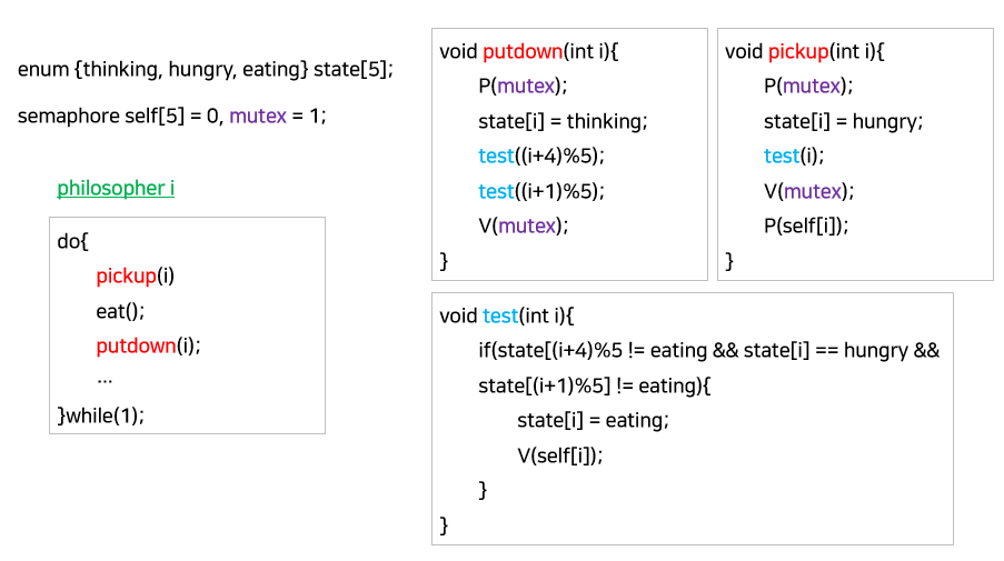 위와 같이 구현하면 이웃한 두 철학자가 동시에 먹는 경우가 없다는 것이 보장된다.