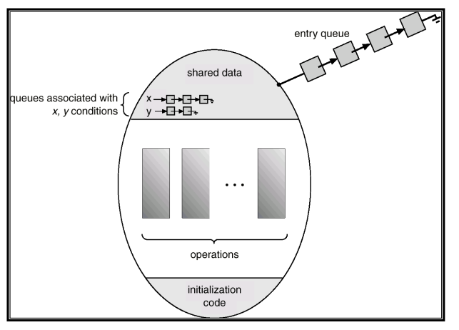 모니터는 공유 데이터 구조, 공유 데이터에 대한 연산을 제공하는 프로시저(Procedure), 현재 호출된 프로시저간의 동기화를 캡슐화한 모듈(module)이다.