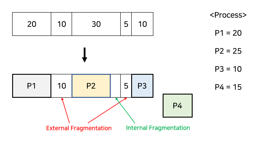 외부 단편화는 총공간을 계산했을 때 프로세스가 들어갈 수 있는 메모리가 있음에도 불구하고 공간들이 연속하지 않아 사용할 수 없는 경우를 말한다.