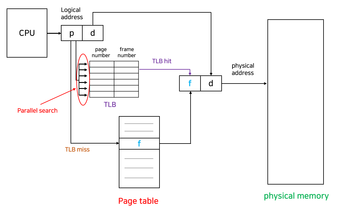 CPU는 page table보다 TLB를 우선적으로 참조하여, 만약 원하는 page가 TLB에 있는 경우 곧바로 frame number를 얻을 수 있고, 그렇지 않은 경우 메인 메모리에 있는 page table로부터 frame number를 얻을 수 있다.