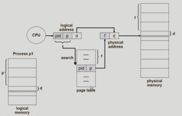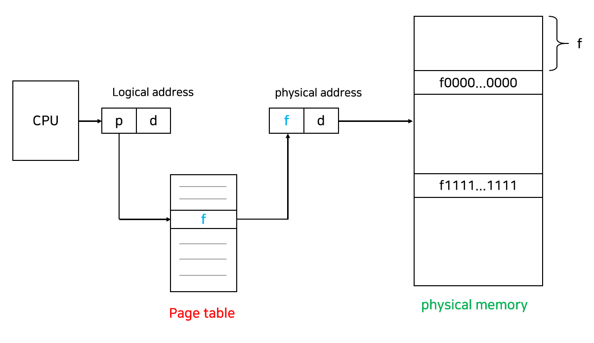 프로세스가 순서대로 메모리에 저장되지 않기 때문에 프로세스를 실행하기 위해선 page가 어느 frame에 들어있는지를 알아야 한다. 이에 대한 정보가 page table이라는 테이블에 저장되어 있고, 이를 사용하여 논리적 주소를 물리적 주소로 변환한다.