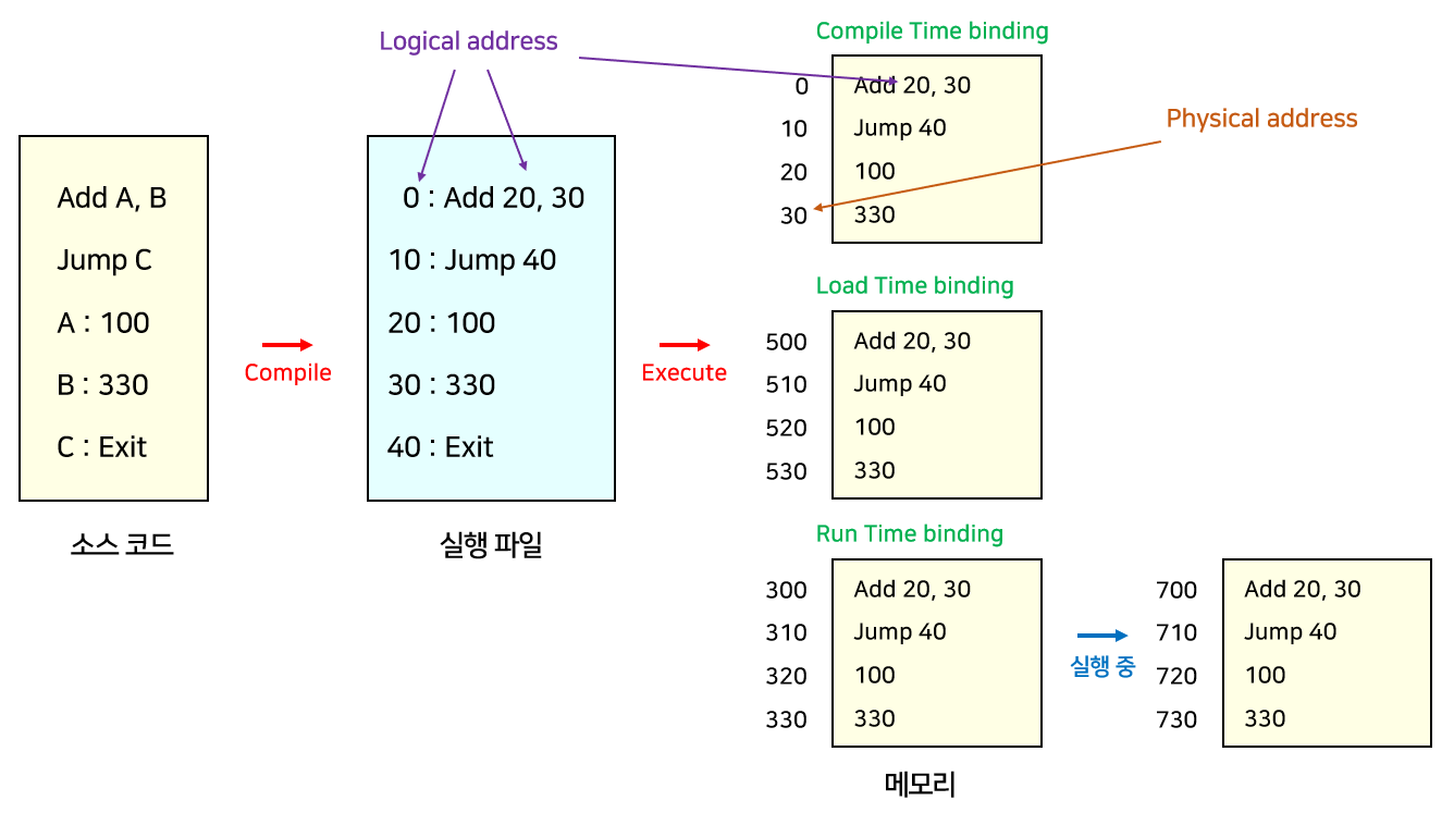 Address Binding은 어떤 프로그램이 메모리의 어느 위치에, 즉 어떤 물리적 주소에 load 될지를 결정하는 과정이다.