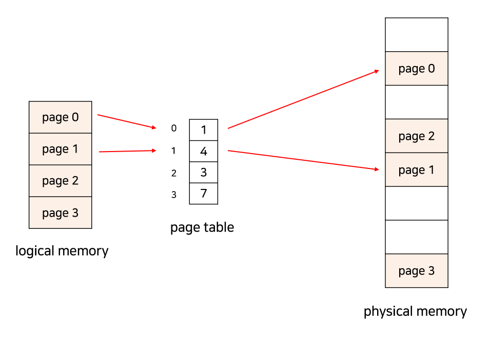 한 프로세스가 사용하는 공간은 여러 page로 나뉘어 관리되고, 각각의 page는 순서와 관계없이 메모리의 frame에 mapping 되어 저장된다.
