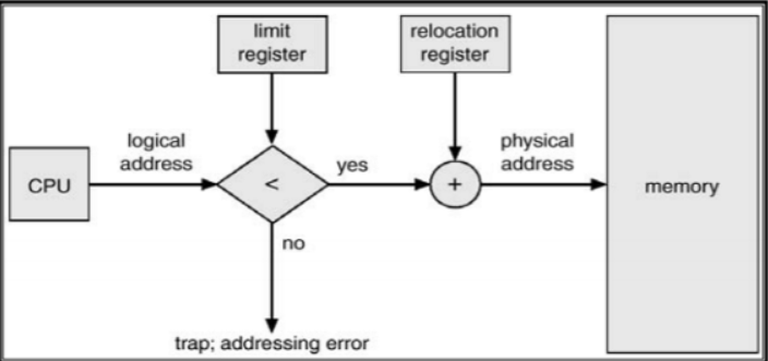 Limit register는 논리적 주소의 범위이며, 잘못된 메모리를 참조하지 않도록 막아주는 기능을 한다. 그리고 Base register(Relocation register)는 접근할 수 있는 물리적 주소의 최솟값을 나타낸다.
