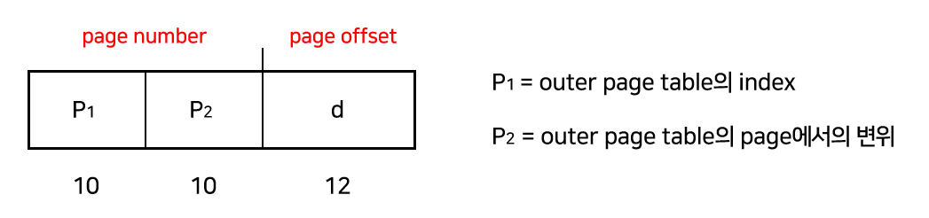 기존에는 32 bit 논리적 주소 공간이라면, 20 bit는 page number, 12 bit는 page offset을 나타냈는데, Two-level인 경우, page table 자체가 page로 구성되기 때문에 page number는 10 bit의 page number와 10 bit의 page offset으로 또 나뉘게 된다.