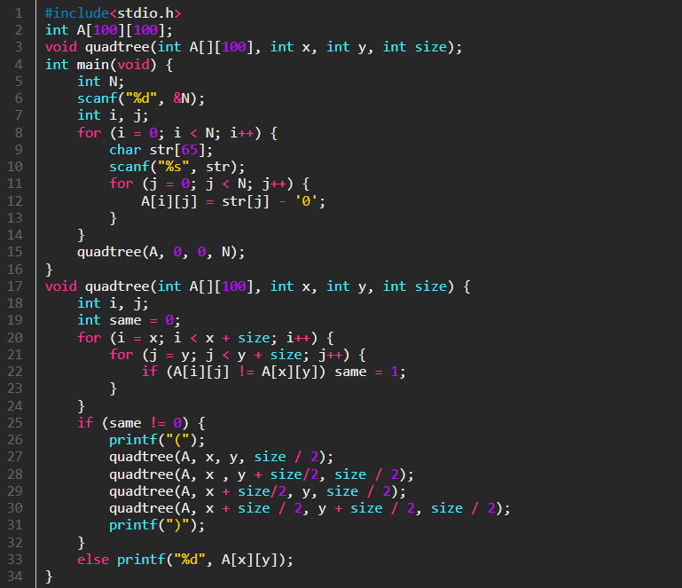 quadtree라는 재귀함수를 작성하여, 해당 사각형내의 숫자가 모두 같은 경우에는 그 숫자를 출력하고,