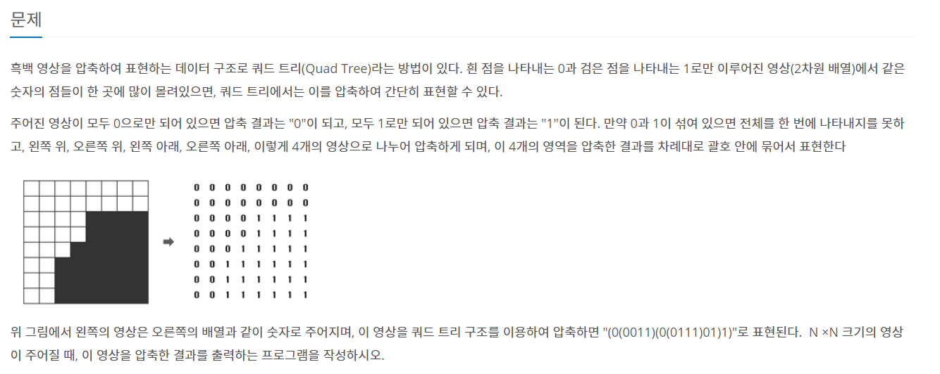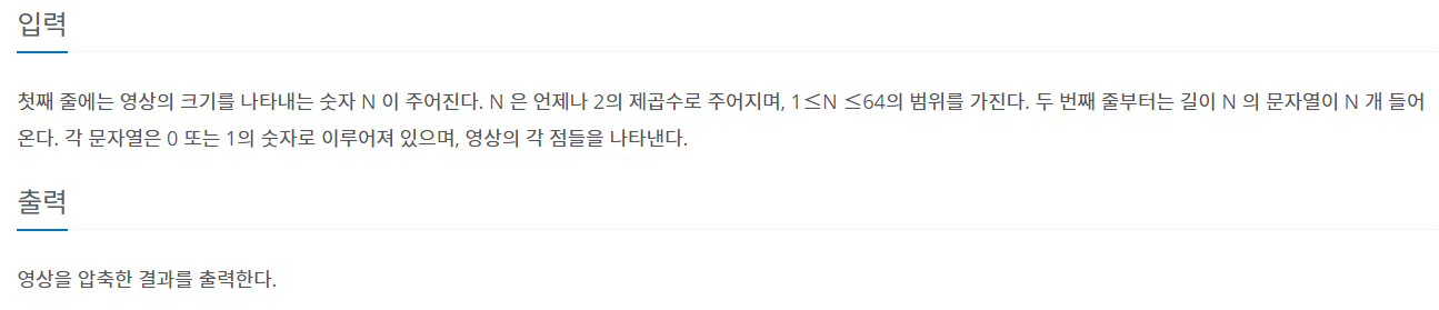 위와 같이 문제가 주어져 있다. 주어진 크기 안의 숫자가 모두 0이거나 모두 1이어야 하고,