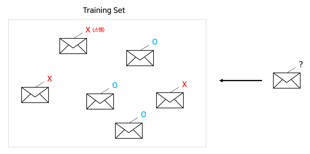 이전에 많은 메일 샘플들을 통해 어떻게 새로운 메일이 스팸인지 아닌지 분류할 수 있을지 학습해야 한다.