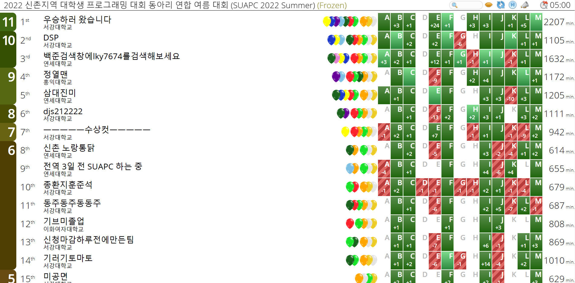 2022 신촌지역 대학생 프로그래밍 대회 동아리 연합 여름 대회 (SUAPC 2022 Summer)에 "우승하러 왔습니다"라는 팀명으로 참가하였다. 조금 늦었지만, 매 대회마다 후기를 작성해온 만큼 이번에도 간단하게 후기를 작성해보려고 한다.