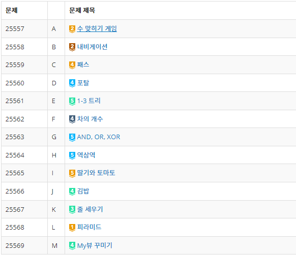 티어는 다음과 같다. 상위권의 실력이 꽤 올라간 건지, 이전 대회들에서는 웬만하면 풀리지 않던 다이아 문제가 이번에는 D번을 제외하고는 모두 풀렸다.