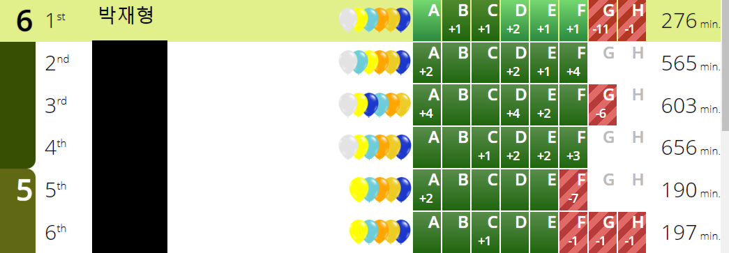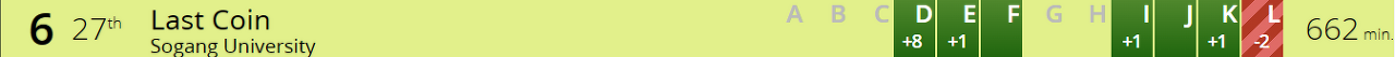 본선 대회 초반에는 계속 한 자리 등수를 유지하며 수상에 대한 기대를 키웠지만, 결국 27등으로 마무리해서 수상과는 거리가 멀었다. 8솔은 해야 수상할 수 있다는 거에 벽을 너무 느꼈고, 오프라인 대회로 참가해 봤다는 거에 의의를 두었다.