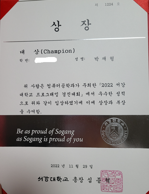 제일 먼저, 신촌 지역 대학생 프로그래밍 대회에 두 번 참가하여 모두 우승을 차지했다. 22년에 쓴 글이 많지 않은데, suapc 후기는 둘 다 작성했기 때문에 후기는 링크로 대체하겠다.