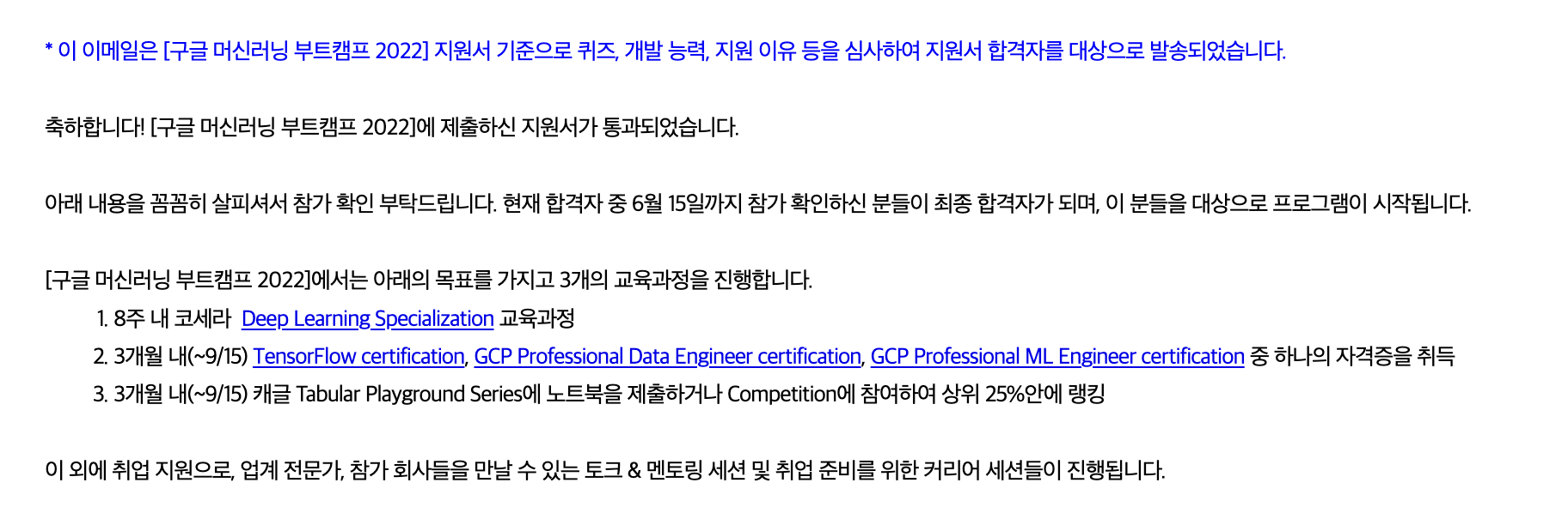 아직 ML에 대한 꿈을 계속 갖고 있었고, 취준 시기이긴 하지만 풀타임 교육도 아니었고, 무엇보다 구글에서 주관하는 거라 올라오자마자 지원했다. 지원 방식이 꽤 특이했는데, ML 교육이니 코테가 없는 건 놀랍지는 않았지만, 면접도 없었고, 구글폼으로 자소서랑 파이썬 관련 문제를 풀어서 제출해 그것만으로 합/불을 가려내는 방식이었다. 특별히 제한시간이 있는 게 아니라 문제도 구글링 해서 풀 수 있었다. 듣기로는 경쟁률이 거의 10대 1이었다고 하는데, 어떻게 선별했는지는 모르겠지만 합격을 하긴 했다.