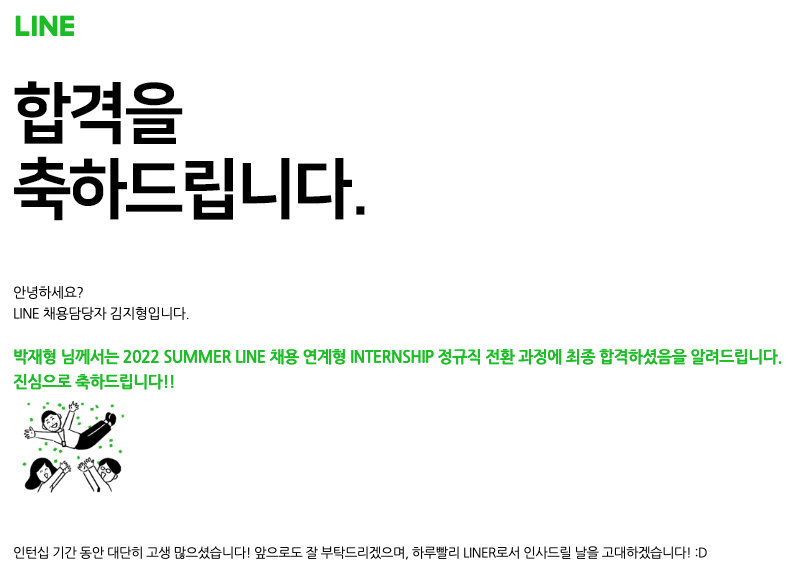 발표가 날 것 같은 날이 되었을 때, 아침부터 휴대폰 진동이 울릴 때마다 놀라면서 메일을 기다리고 있었는데 역시나 오후에 메일이 왔다. 10초간 속으로 기도를 하고 메일을 열었을 때는, 힘들게 보냈던 인턴 생활이 주마등처럼 스쳐 지나갔다. 그전까지는 만약 합격을 한다면 펑펑 울 것 같다는 생각을 했는데, 막상 합격 메일을 보니 실감이 안 나고 얼떨떨했다. 집에 연락을 해서 매우 좋아하시는 부모님의 목소리를 들으니 그때서야 취업을 했다는 실감이 났던 것 같다.