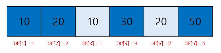 따라서 LIS는 [10, 20, 30, 50] 이 만들어지고 길이는 4로 나오게 된다.