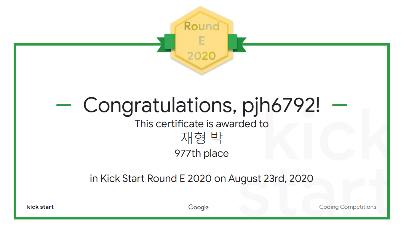 Google Kickstart Round E에 참여했다. round D보다는 훨씬 어려웠던 것 같다. 1번 문제를 제외하고는 만점을 받을 자신이 없어서 2번과 3번은 부분점수만 긁었다. 그래도 처음으로 1000등 안에 들었다. 다들 어찌 그리 문제를 잘 푸는지