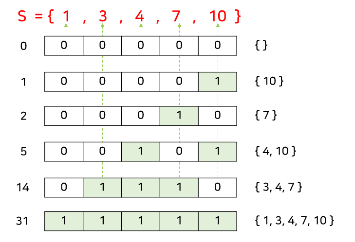 위 그림과 같이 0부터 31까지의 각 숫자들이 하나의 부분집합에 일대일로 대응이 된다.