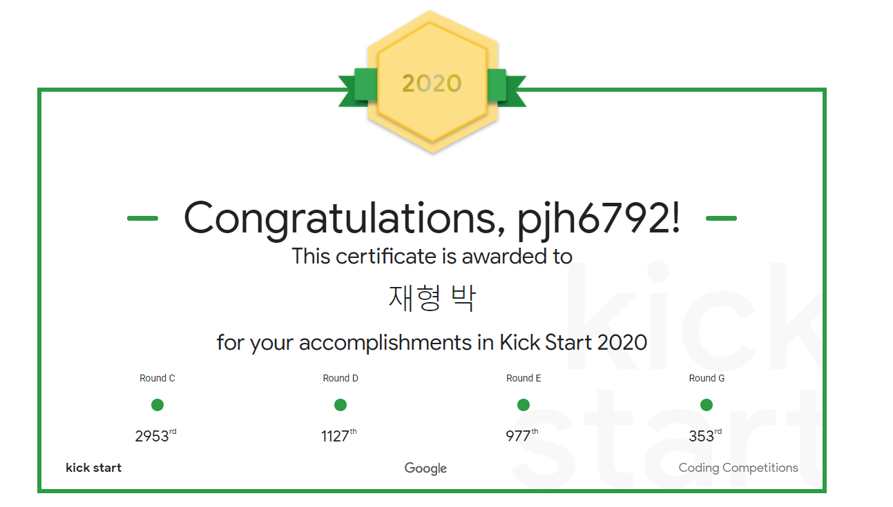 Google Kickstart Round G에 참여했다. 참여자가 적어서 등수가 많이 오른 것 처럼 보이는 건 함정....