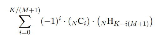 그러면 구해야 하는 방정식의 해는 $a_1 + a_2 + ... + a_n = K-Nm (a_i \leq M-m) $을 만족하는 순서쌍의 개수이다.