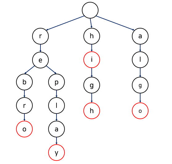 다음 그림은 문자열 집합 {"rebro", "replay", "hi" , "high", "algo"} 를 트라이로 구현한 것이다.