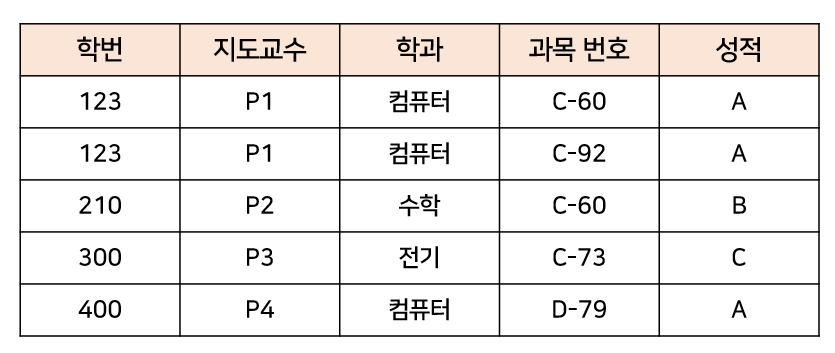 - 학번이 123인 학생의 지도교수가 P2로 변경되면, 123인 학생이 수강하는 모든 과목(행)에서의 지도교수를 변경시켜주어야 한다.